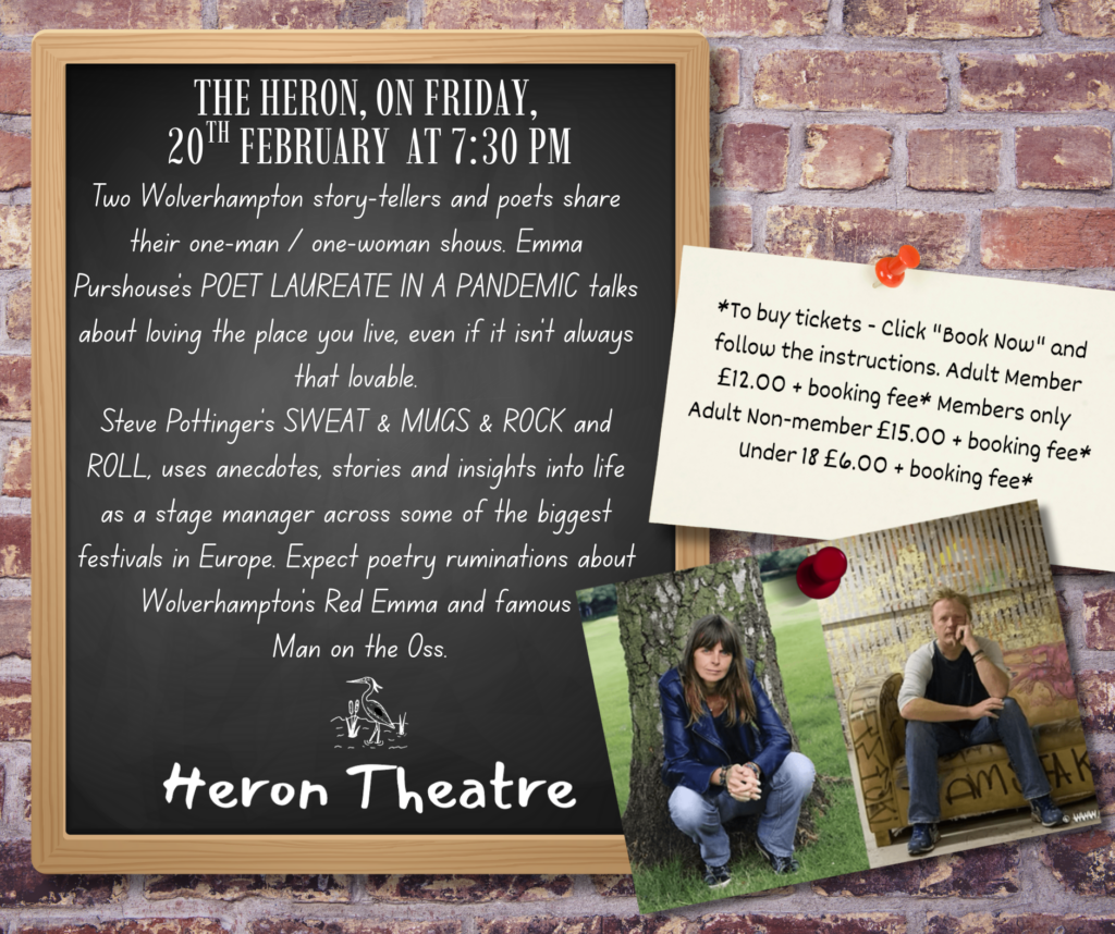 Excited to share some great news from The Heron Theatre! It’s my pleasure to confirm the appearance of two talented Wolverhampton story-tellers and poets, Emma Purshouse and Steve Pottinger, at our venue on Friday, February 20th at 7:30 PM.